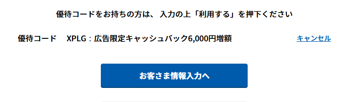 優待コードの入力忘れだけで、6,000円のキャッシュバックが少なくなります…