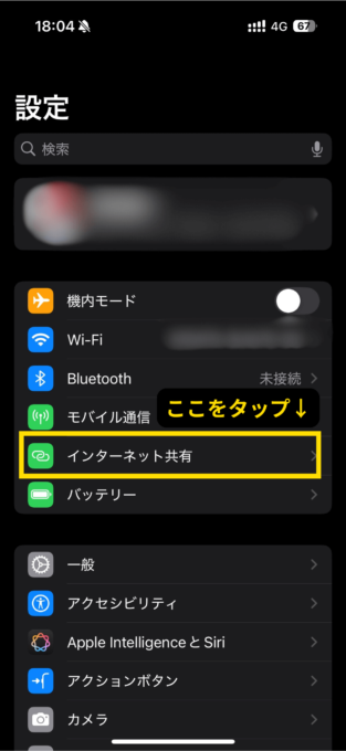 設定の「インターネット共有」をタップ