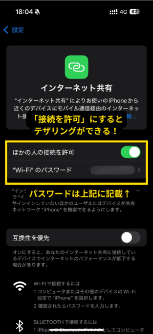PCなどのWiFi接続画面に「iPhoneの名前」が出るので、それをタップしてパスワードを入れると接続できます。
